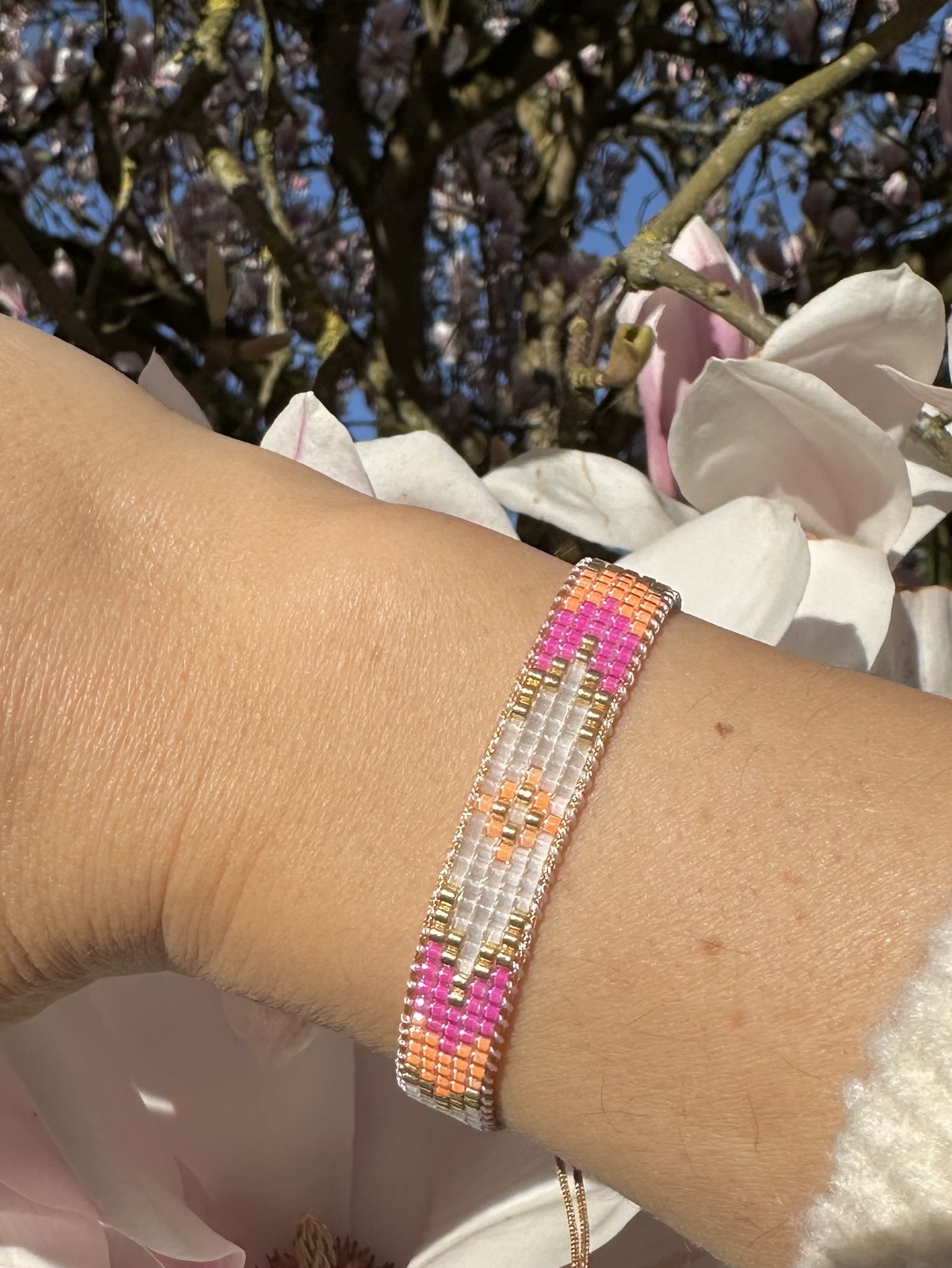 Une véritable dose d'énergie positive à votre poignet. Cette manchette puise son inspiration dans la richesse des textiles brodés et des fleurs tropicales. Ses contrastes audacieux entre le rose fuchsia, l'orange corail et le blanc transparent sont soulignés par des accents dorés qui captent la lumière avec éclat. C’est le bijou "feel-good" par excellence, conçu pour celles qui aiment que leurs accessoires racontent une histoire pétillante et pleine de vie.