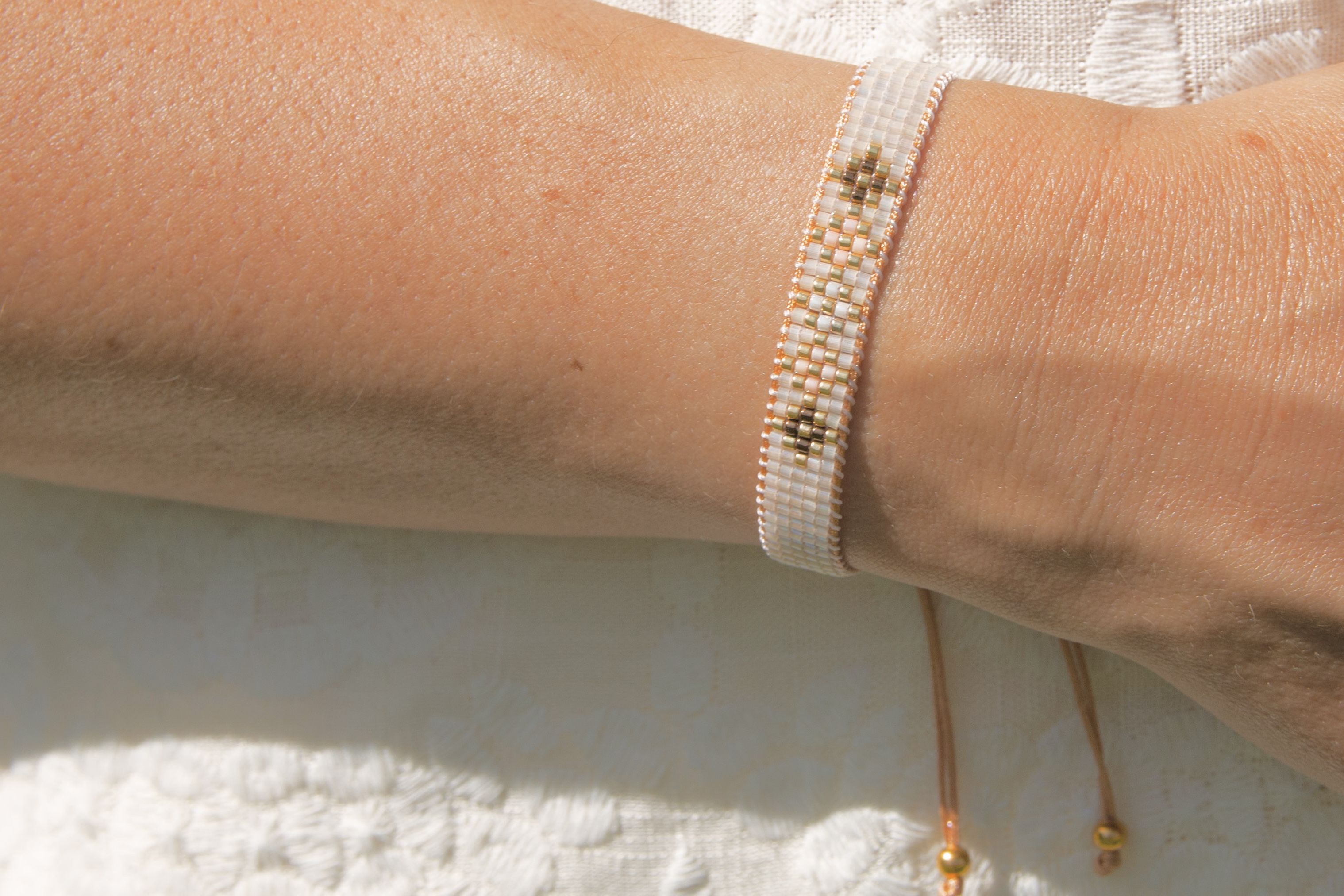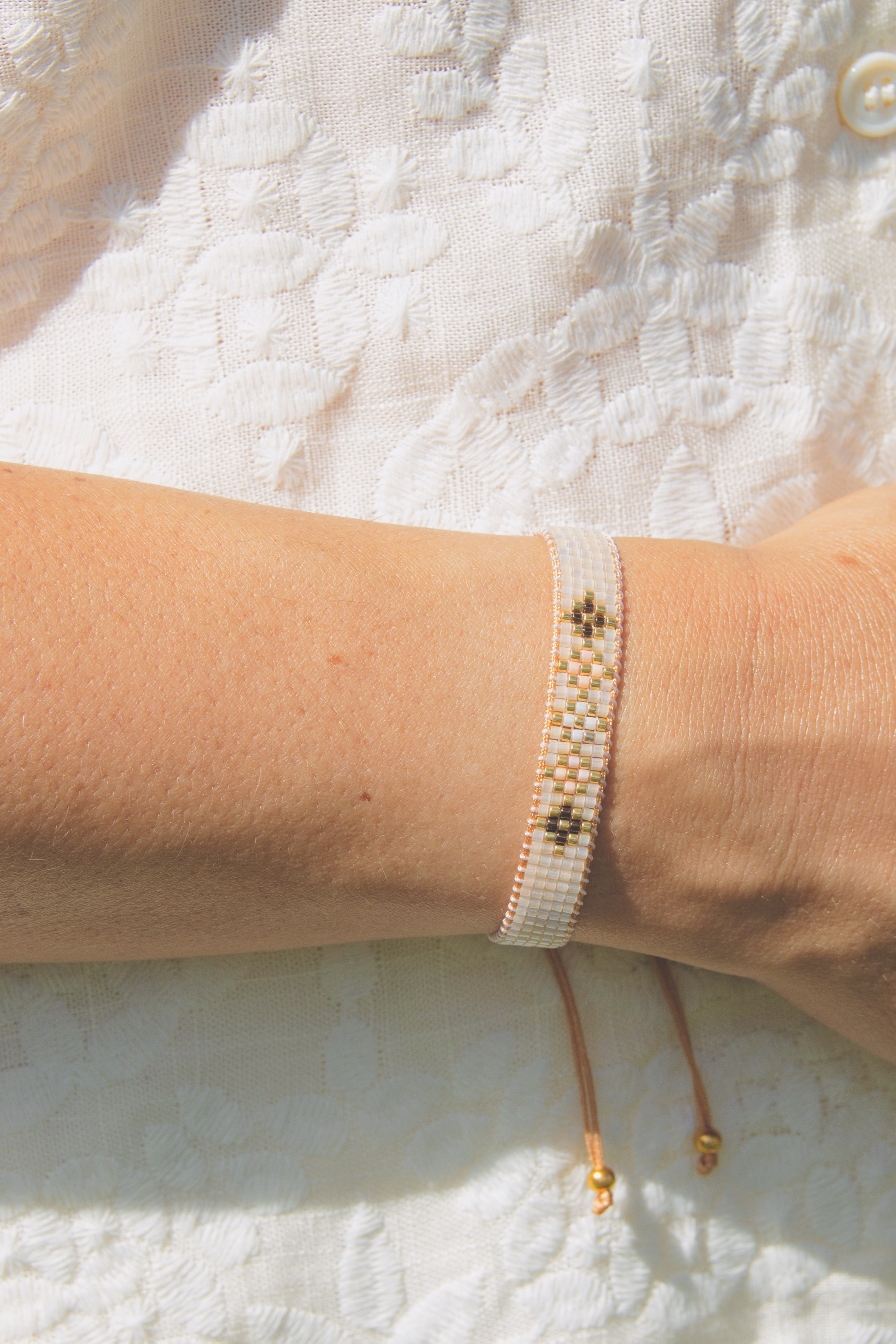 Une caresse de lumière à votre poignet. Ce bracelet tissé à la main se pare de teintes délicates : un blanc nacré marié à des touches de rose poudré, kaki et doré. Son motif central, évoquant les symboles solaires ancestraux, apporte une dimension spirituelle et protectrice. C’est le bijou idéal pour celles qui recherchent une évasion douce, une touche de poésie nomade qui s'accorde avec toutes les tenues.