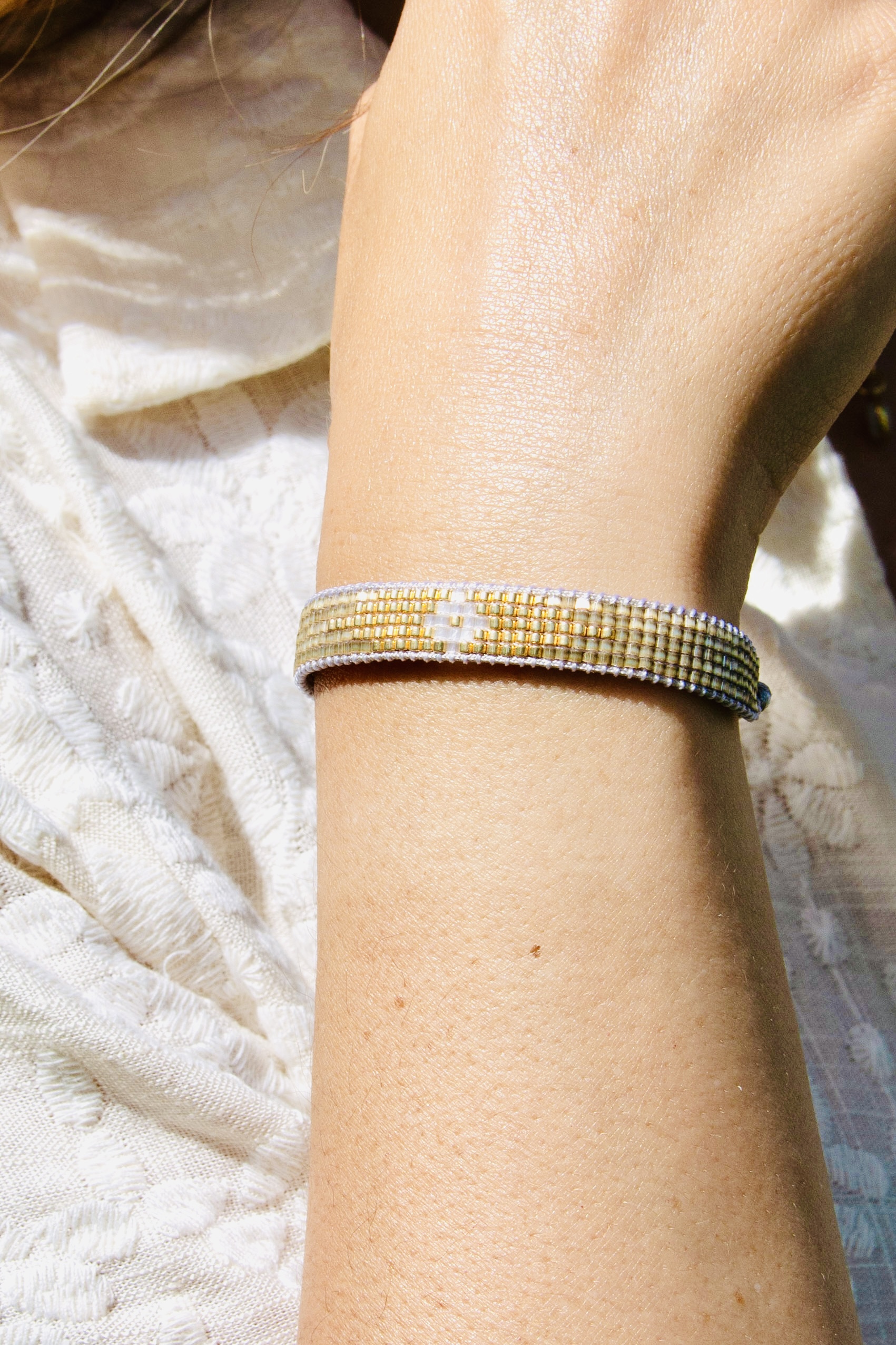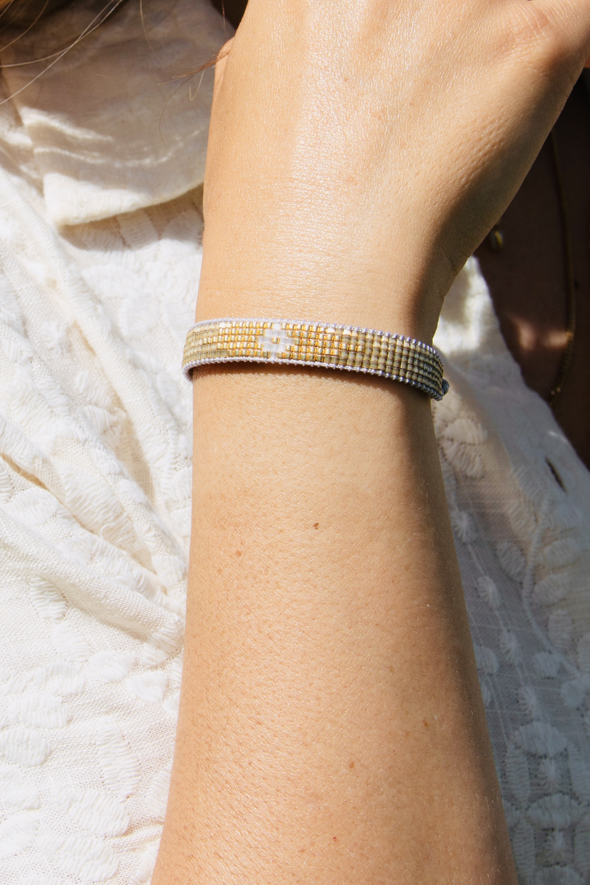 Apportez une touche de lumière et de douceur à votre poignet avec ce bracelet tissé à la main. Alliant finesse technique et esthétique bohème-chic, ce bijou est l'accessoire idéal pour parfaire un look estival ou illuminer une tenue quotidienne.
