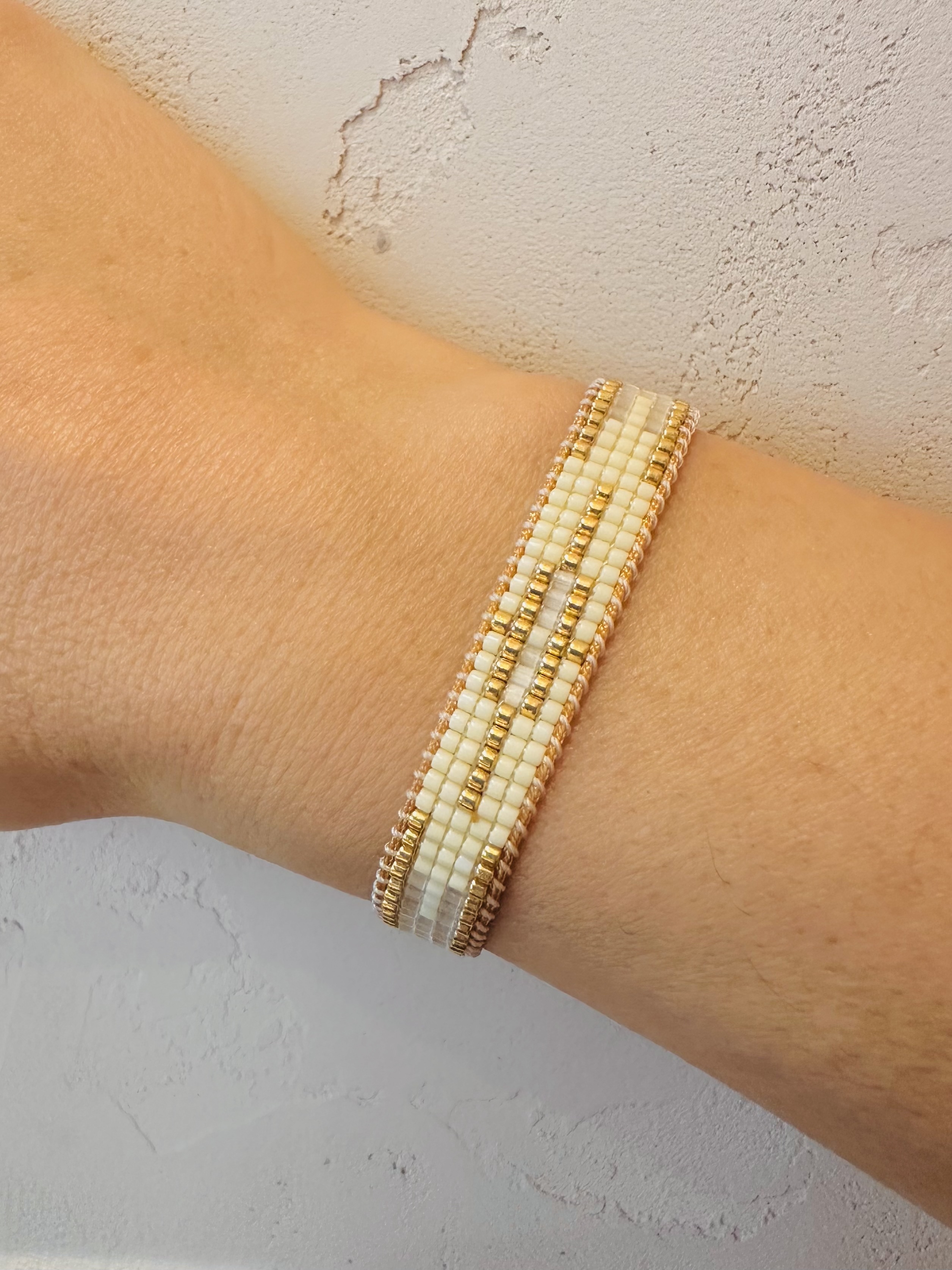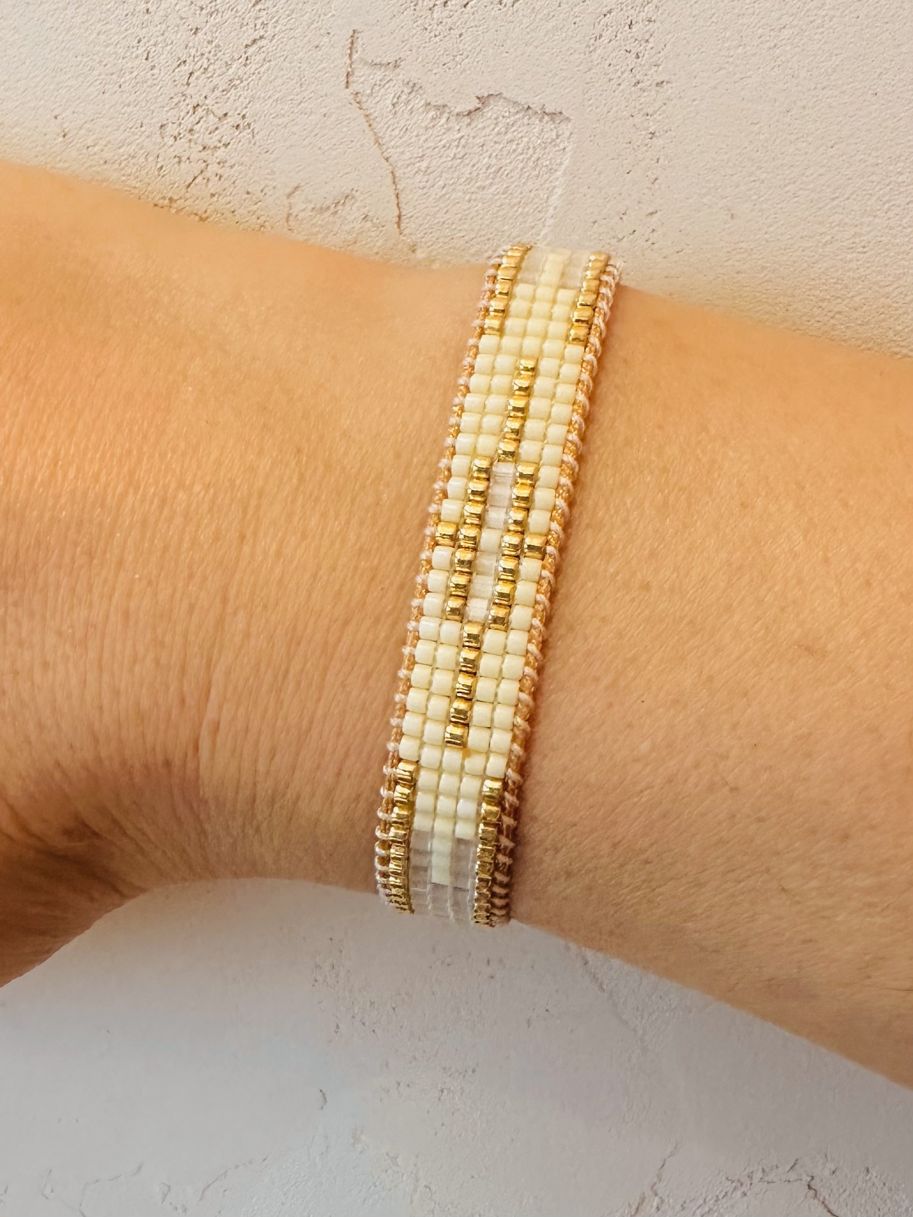 - Harmonie de Matières : Un mariage chic entre des perles japonaises au fini mat jaune pastel et des accents blancs et doré pour de la brillance.