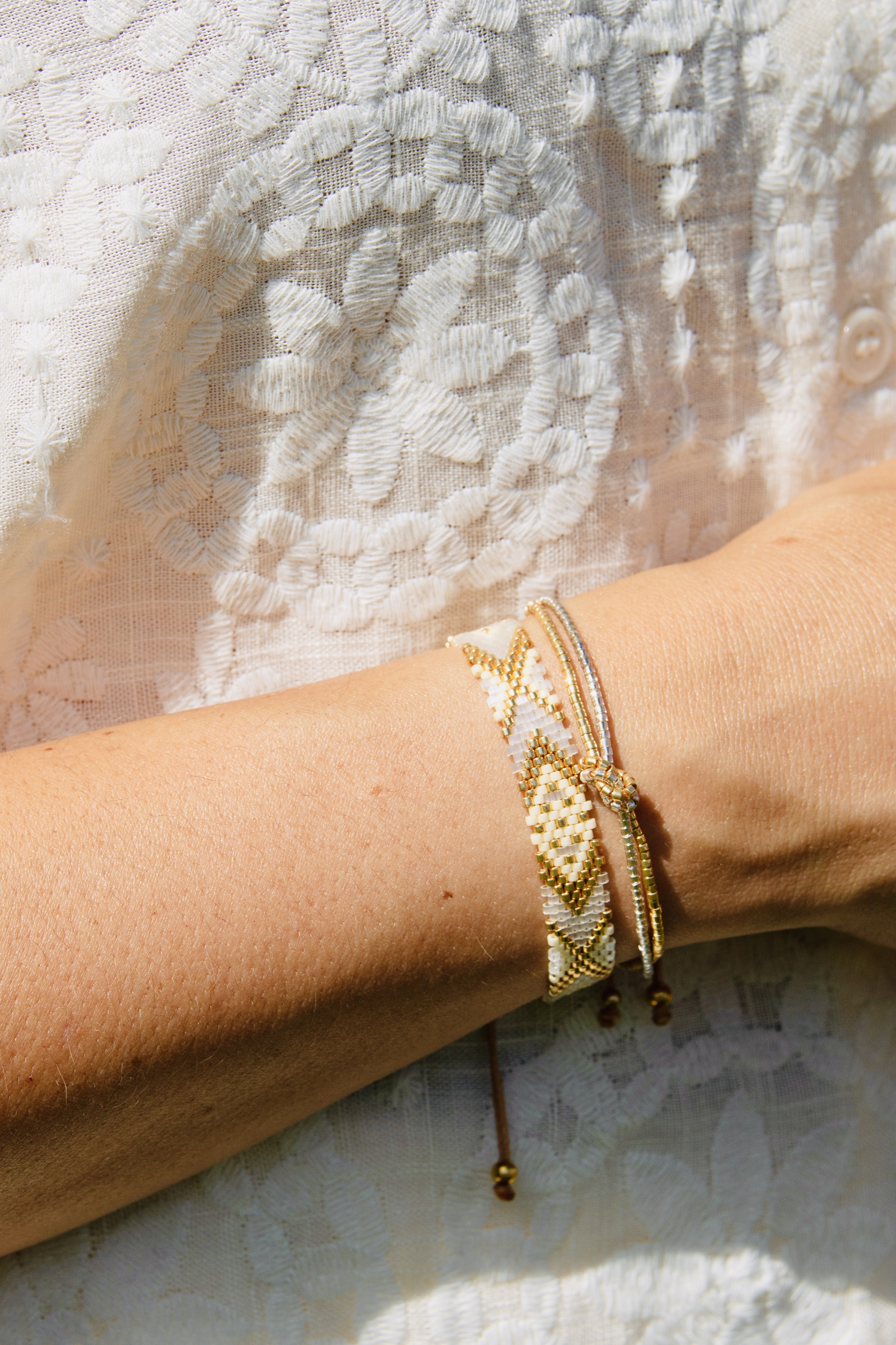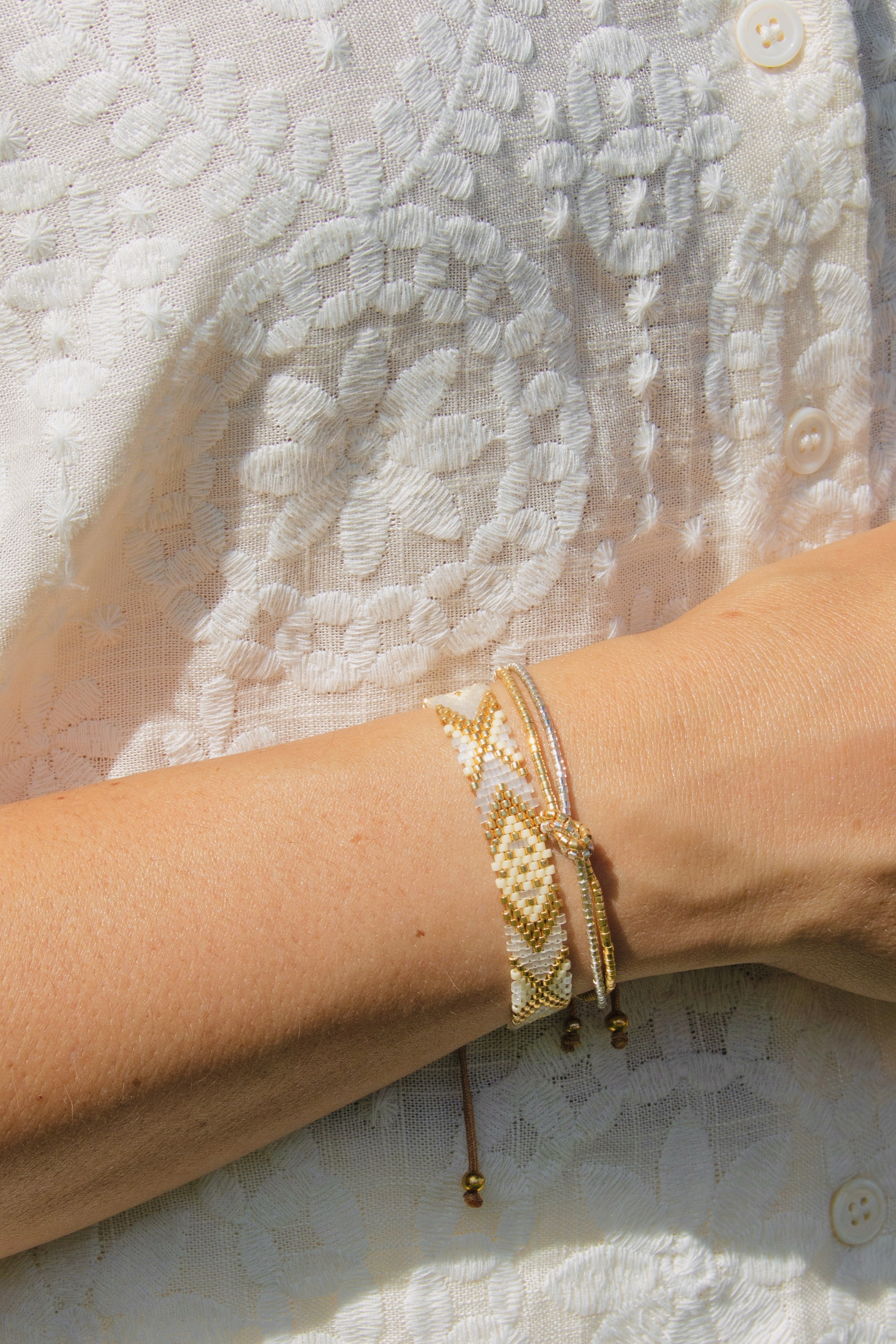 Une invitation à l'évasion immédiate. Ce duo capture la lumière pure des journées d'été pour la fixer à votre poignet. Le bracelet large, avec ses motifs losanges d'inspiration ethnique, évoque la richesse de l'artisanat d'Amérique Centrale, tandis que le bracelet fin en perles dorées apporte une touche de délicatesse minimaliste.